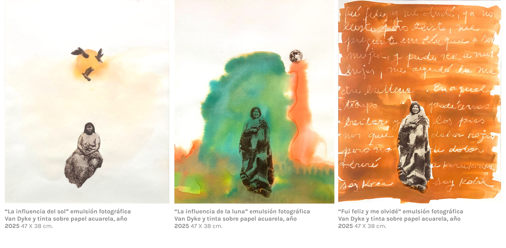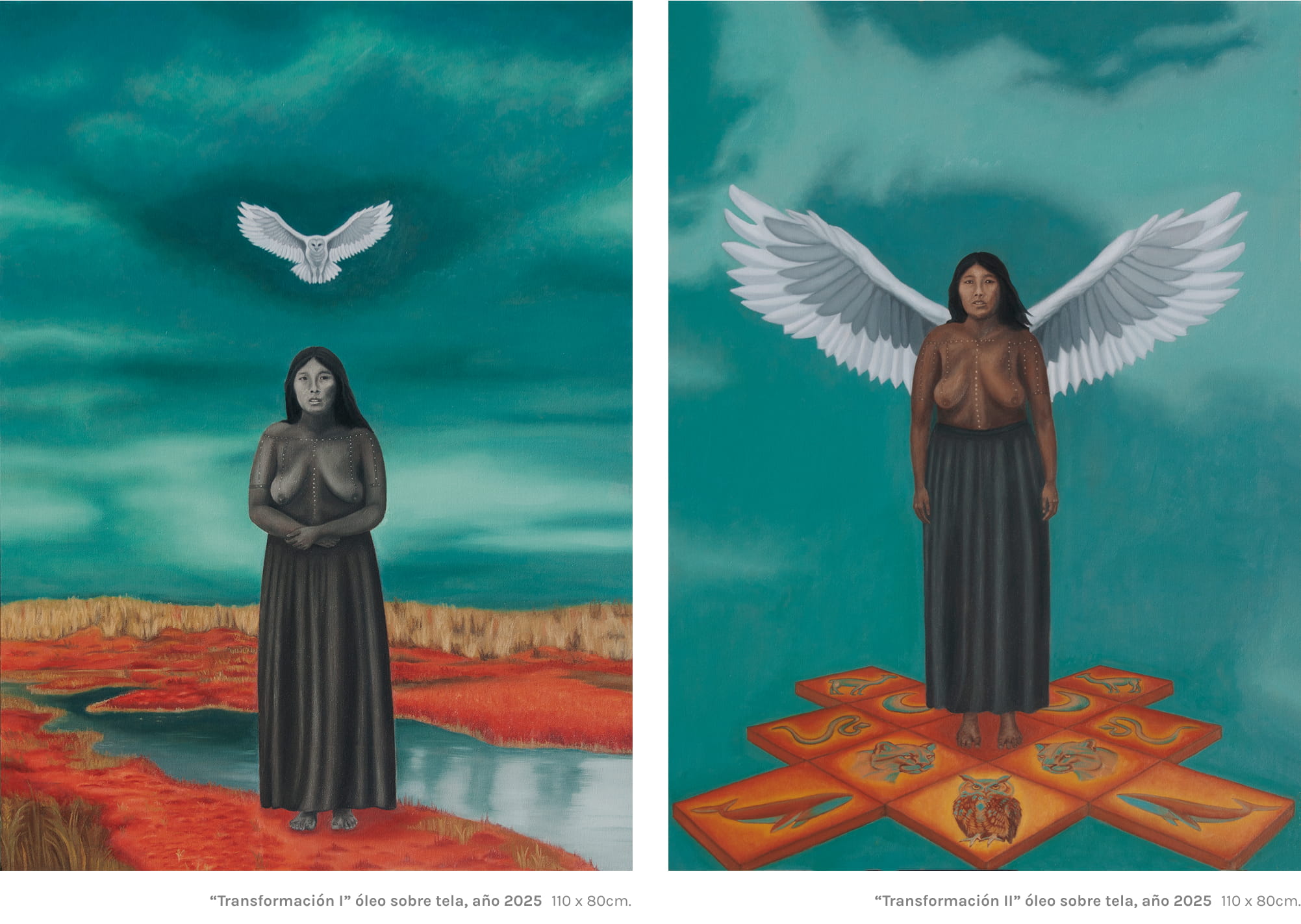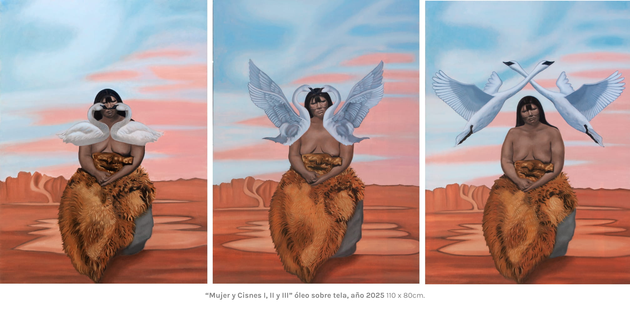 Karla pone en relieve el universo de lo femenino en su obra. En esta ocasión, se inspira en un relato mítico de la era Hóowin de los Selk’nam, un tiempo en que “la muerte no existía”. En ese mito, las mujeres se reunían para consagrarse en la ceremonia de la Haina, interrumpida abruptamente cuando algunas de ellas, perseguidas, escapan transformándose en aves. Ese vuelo marca el fin de una era matriarcal.