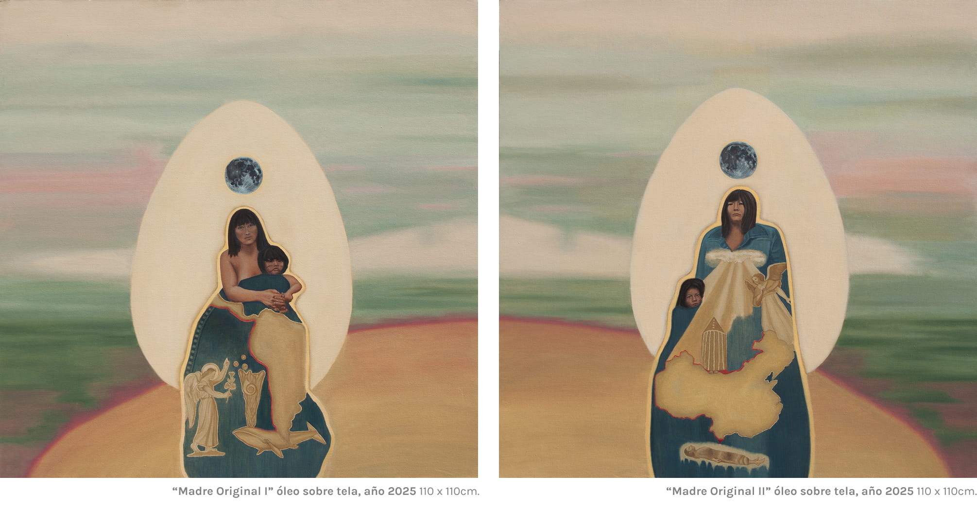 En los estudios de Marija Gimbutas (El lenguaje de la diosa) y de Joseph Campbell (Diosas), se evoca el culto a la mujer como primer ser venerado por la humanidad. Desde el Paleolítico, hace más de 30.000 años, la figura femenina aparece en la memoria mítica como guardiana del hogar y madre de la vida espiritual. La diosa, como principio primordial, otorga el nacimiento físico y también el renacer espiritual, revelando la naturaleza más elevada de lo humano. En esta obra, lo sagrado femenino se encarna en imágenes de madonnas y/o vírgenes con sus hijos, retratadas con un aliento renacentista. Algunas de ellas sostienen historias de muerte y renacimiento; otras se acompañan de aves, como símbolo de vconexión con lo divino.
